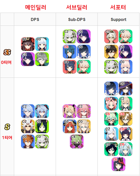 늘 강조하는 부분이지만 위 등급표, 티어표들은 공식적인 평가가 아니고 일부 유저의 개인적인 견해가 들어간 티어표 이기때문에 절대적인 기준이 될 수 없습니다. 좋은 평가가 되어 있는 캐릭터라도 내가 현재 보유하고 있는 캐릭터들이나 상황들에 의해서 성능을 발휘하지 못할 수도 있습니다. 어디까지나 참고만하는 것을 권장드립니다!!