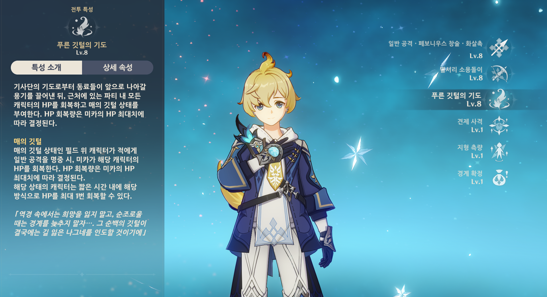 물리 강화에 초점이 맞춰진 미카지만 법구 캐릭터들이 히트렉이 발생하지 않는다는 점으로 인해 미카가 제공하는 공격 속도 증가 버프를 최대한 활용하는 방향으로 방랑자 파티에서 미카를 활용할 수 있습니다