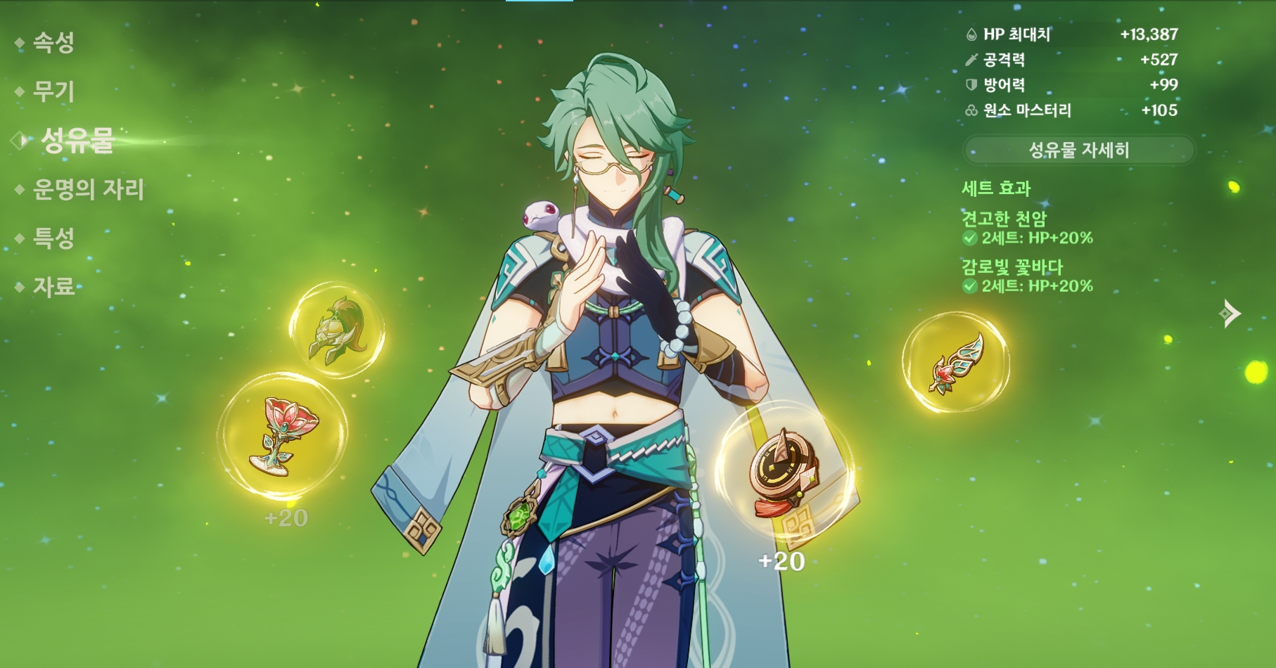 백출에게 필요한 옵션인 HP, 치유 보너스, 원소 충전 효율을 선택할 수 있는 22세트