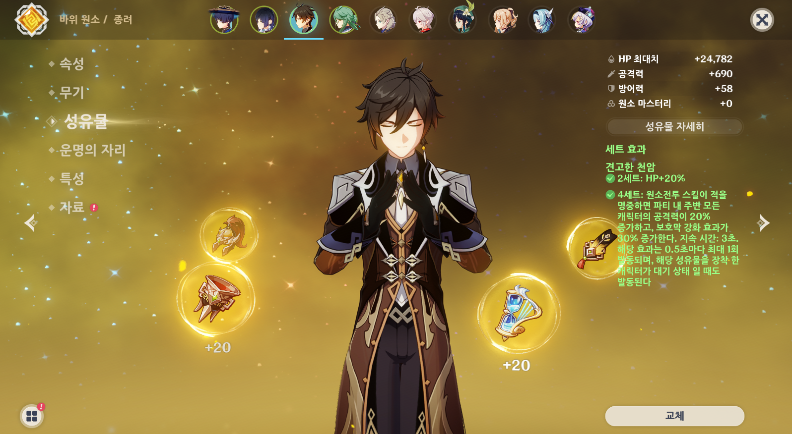 종려의 강력한 원소 폭발 대미지 하나만 보고 세팅하는 구성으로 바위 원소 피해 증가 15%와 원소 폭발 대미지 20% 증가를 동시에 챙겨서 강력한 한 방딜을 낼 수 있게 해준다.