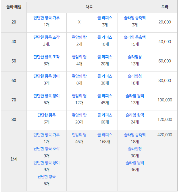 슬라임 원액 : LV.60 이상 슬라임 드랍, 슬라임 응축액, 슬라임청으로 합성 획득