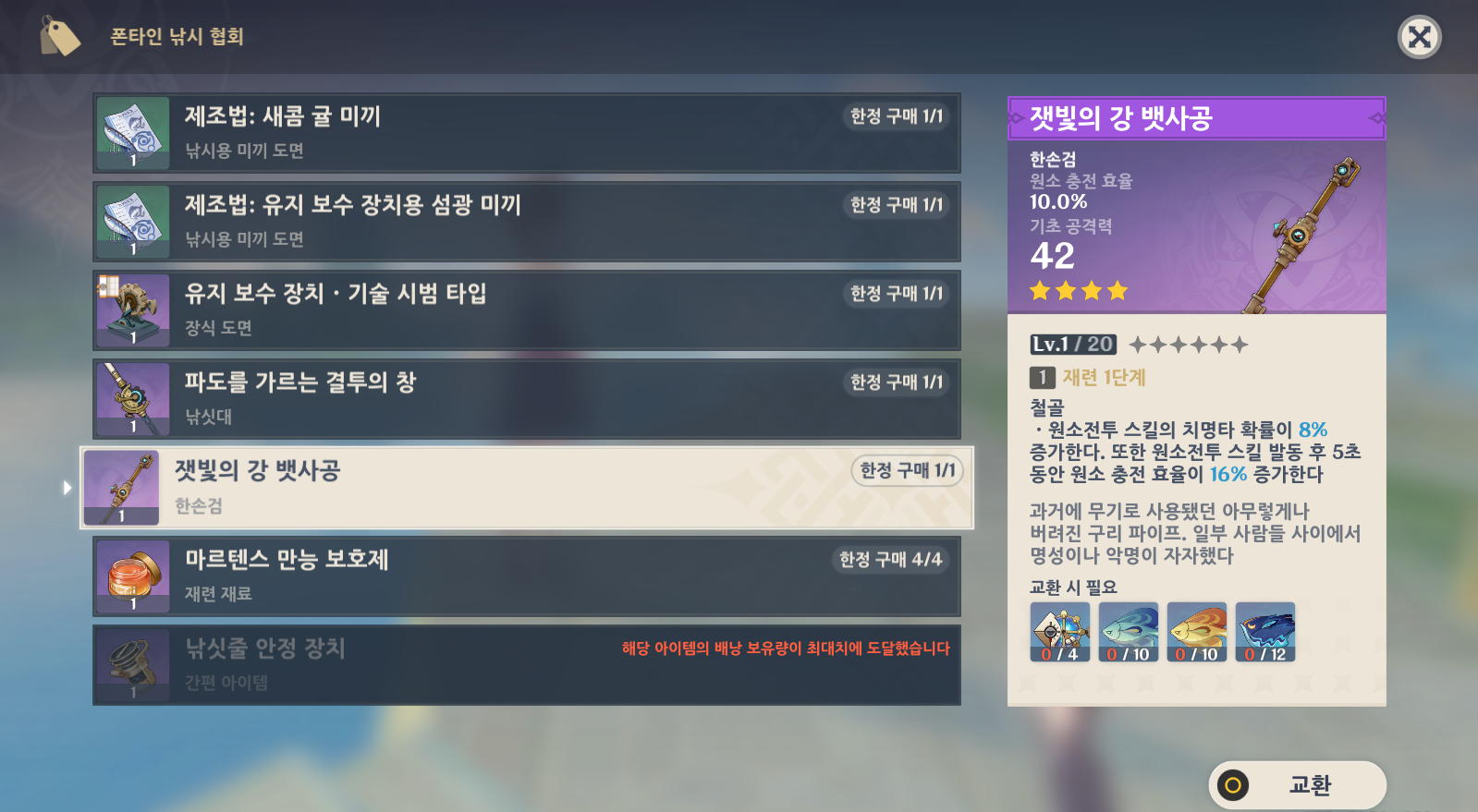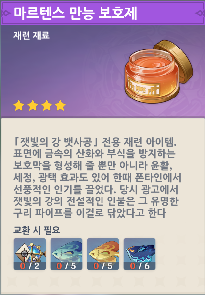 폰타인 낚시 협회에서는 한손검 무기 '잿빛의 강 뱃사공'과 뱃사공 재련재료인 '마르텐스 만능 보호제'를 물고기와 교환가능합니다.