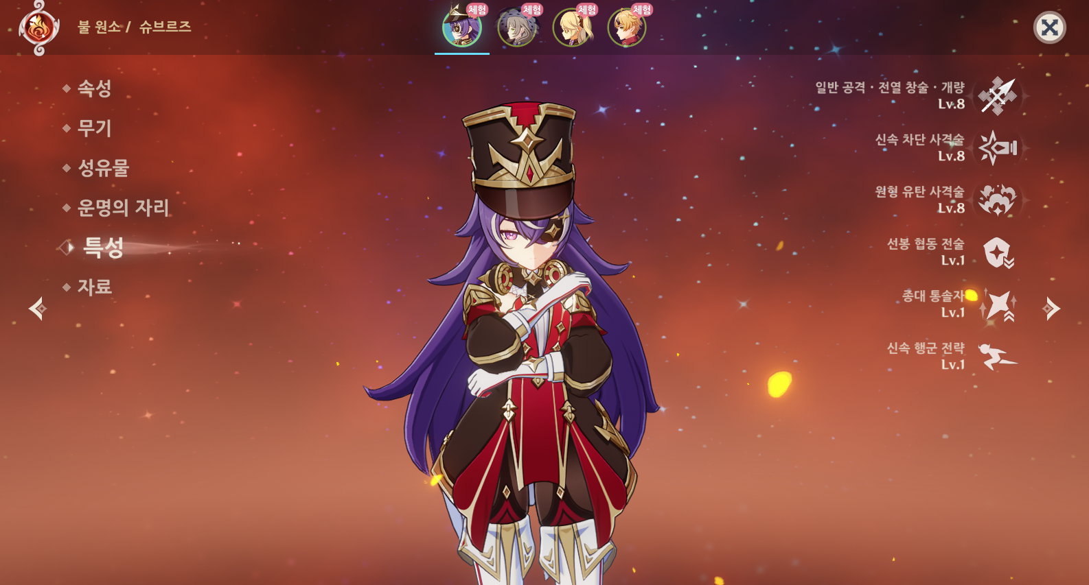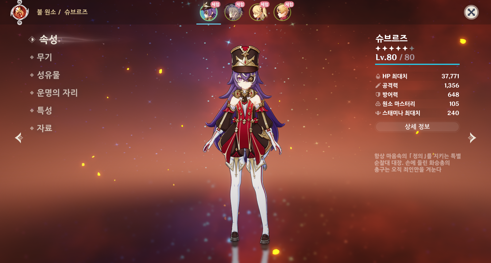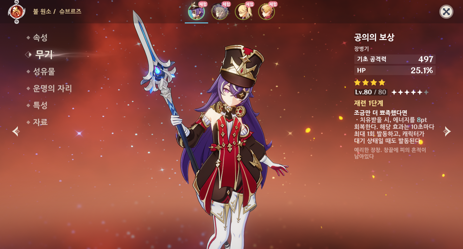 원신 슈브르즈는 불원소 장병기를 사용하는 캐릭터로 원신 최초로 등장한 과부하 반응 지원 서포터이자, 베넷 이후 처음으로 등장한 불 원소 힐러