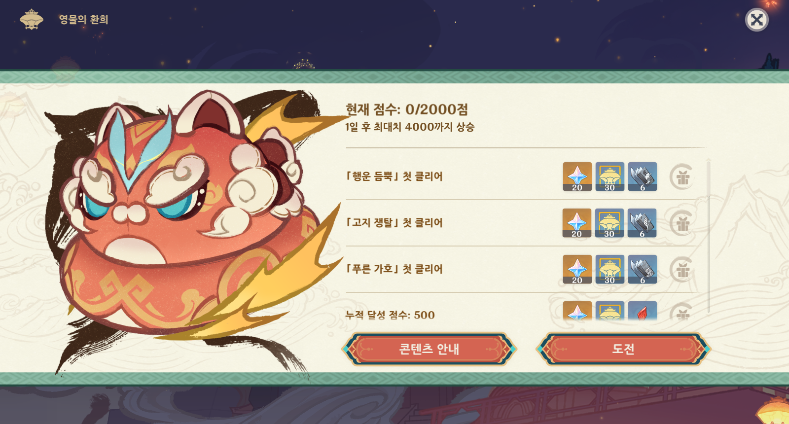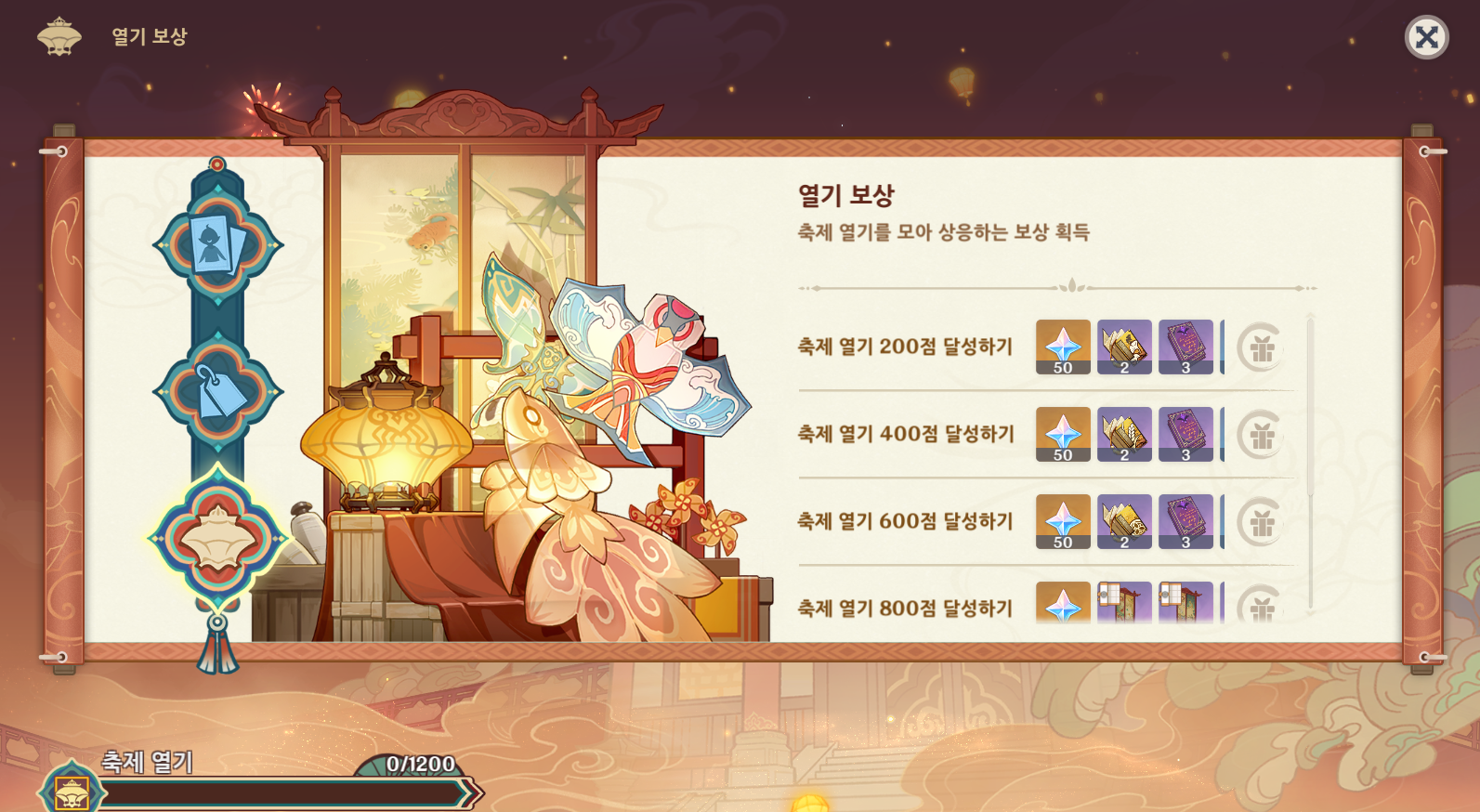 축제열기 800점 달성 이후 가명,사유,향릉,북두,행추,응광,중운,신염,운군,연비 중 1명 파티 초대 가능합니다.(캐릭터 1명을 준다는 의미입니다)