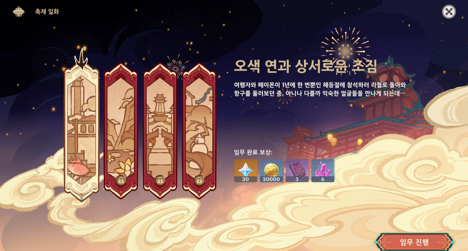 축제일화는 총 4개가 있습니다. 일화 1개당 임무 완료보상 원석은 30개입니다.