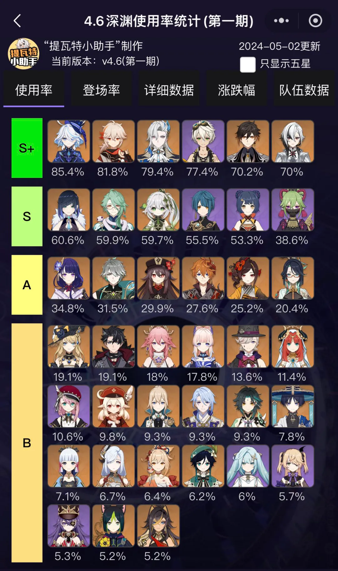 | S | 야란,백출,나히다,행추,향릉,쿠키시노부 |