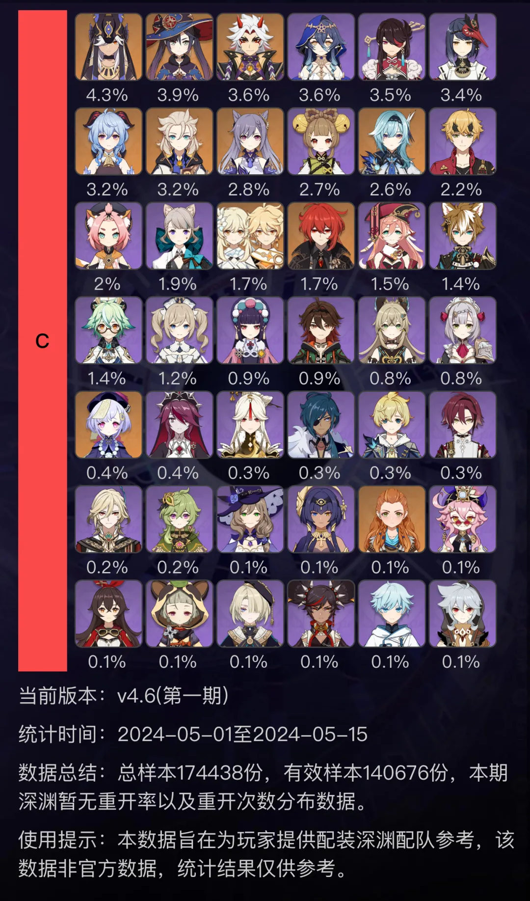 | C | 사이노,모나,이토,레일라,북두,쿠조사라,감우,알베도,각청,요요,유라,토마,디오나,리넷,여행자,다이루크,연비,고로,설탕,바바라,운근,가명,키라라,노엘,치치,로자리아,응광,케이아,미카,헤이조,카베,콜레이,리사,캔디스,에일로이,도리 |