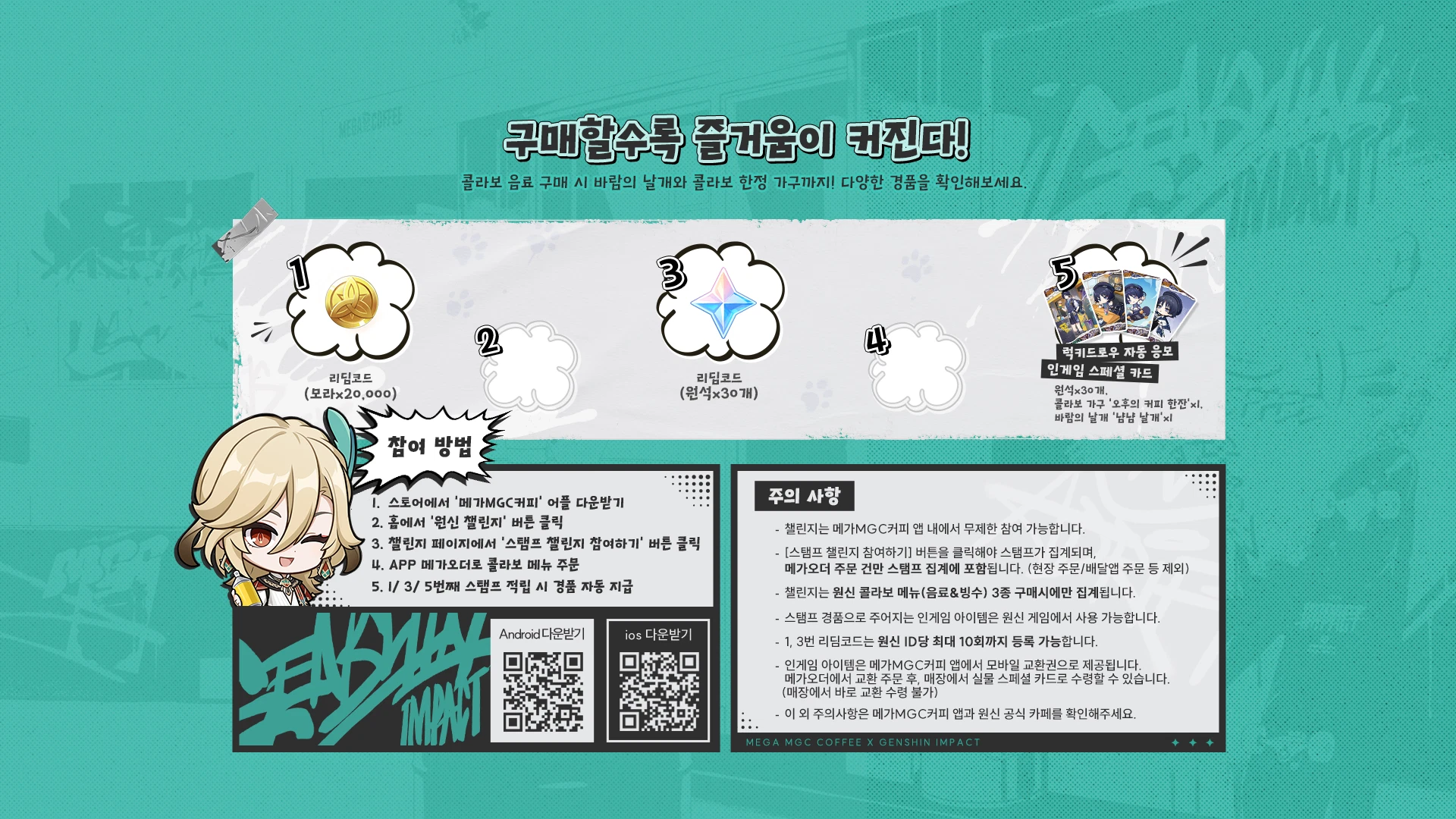 원신은 전 세계적으로 인기를 끌고 있는 모바일 및 PC 게임입니다. 메가커피는 많은 사람들이 즐겨 찾는 커피 전문점으로, 이번 콜라보를 통해 특별한 이벤트를 진행하고 있습니다. 이 콜라보레이션의 핵심은 스탬프 챌린지로, 메가커피 매장에서 스탬프를 모아 다양한 원신 관련 상품을 받을 수 있습니다.