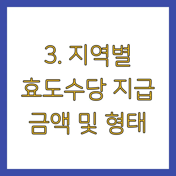 아래는 몇몇 지역의 일반적인 효도수당(또는 유사 명칭 지원금)의 예시이며, 이는 예시일 뿐 실제 지급 금액 및 정책은 변경될 수 있으므로 반드시 해당 지자체의 최신 정보를 확인해야 합니다.