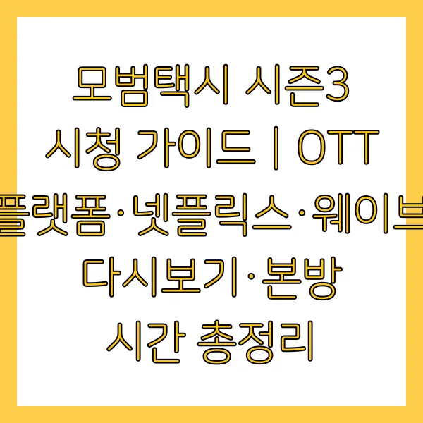 매 시즌 사회의 어두운 면을 날카롭게 꼬집으면서도 가슴 후련한 복수를 선사하며 시청자들의 마음을 사로잡았던 '모범택시'. 과연 시즌3에서는 또 어떤 기상천외한 '부캐'와 복수 작전으로 우리를 놀라게 할까요? 이번 포스팅에서는 '모범택시 시즌3'를 본방 사수하고, 놓치지 않고 다시 즐길 수 있는 모든 방법을 상세하게 정리해 드립니다. 본방 시간부터 OTT 플랫폼 다시보기, 주요 출연진과 놓칠 수 없는 시청 포인트까지! 지금부터 함께 떠나볼까요?
